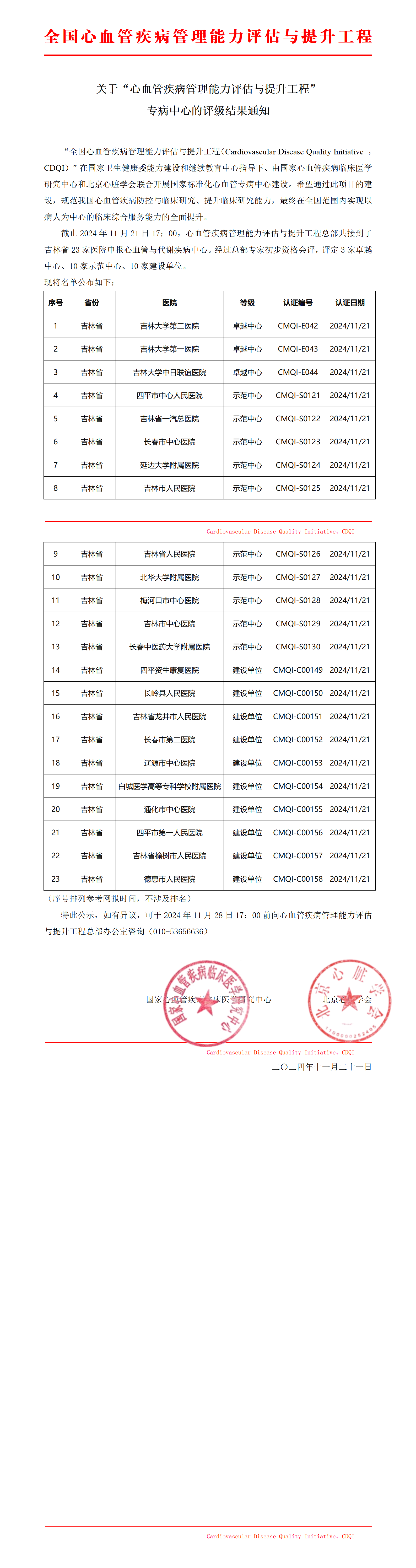 关于国家标准化心血管与代谢疾病中心评级结果通知-吉林省